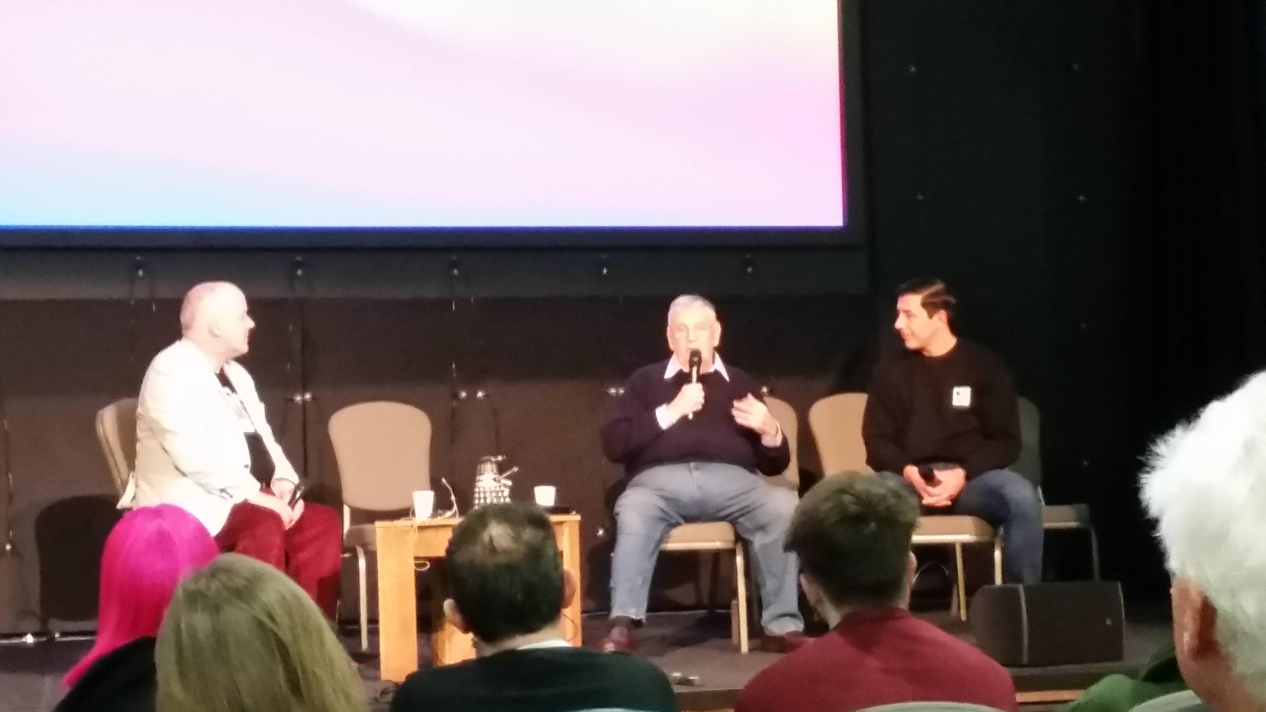 The second panel featured two companions of the Second Doctor: Frazer Hines (Jamie McCrimmon) and Wendy Pandbury (Zoe Heriot), who both recounted their memories of working with Patrick Troughton. For Frazer, Pat was “an absolute joy” who was always in a good mood and excited to meet new cast members. They both shared a cheeky sense of humour and often tried to slip innuendo into the script, such as their exchange at the start of The Two Doctors (1985) (“Look at the size of that thing, Doctor!” “Yes, Jamie, it is a big one.”) Wendy described Patrick as “a wonderful man” who advised her on how to become a professional actor, emphasising the importance of avoiding the press and keeping one’s private life. In Frazer’s case, however, his appearances in a popular television show sometimes led to unwanted attention: he remembered being approached by a tough-looking bloke who wanted spoilers for the following week’s episode, while Wendy recalled an incident where Frazer was heckled by a taxi driver. After being asked “Are you that bloke who wears that stupid kilt in that stupid TV program?” Frazer immediately responded with, “Yes, are you the t*sser who watches it?”